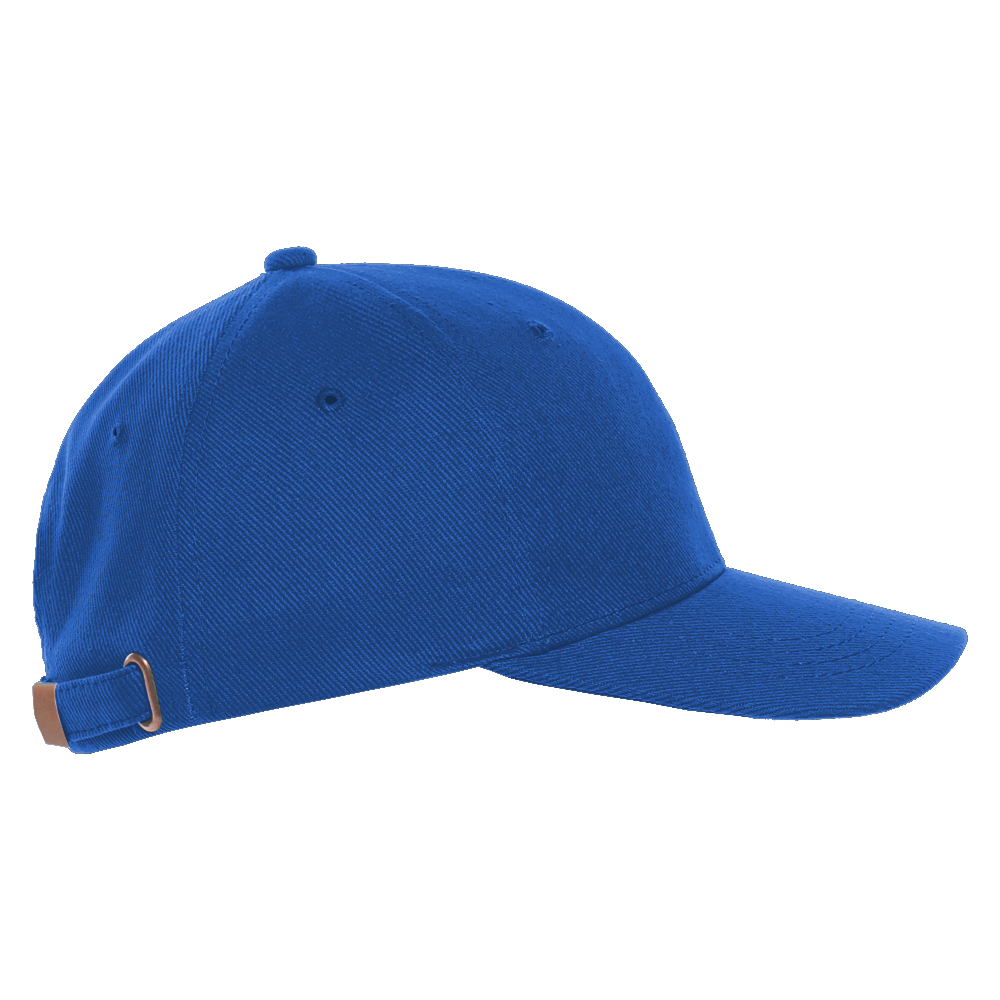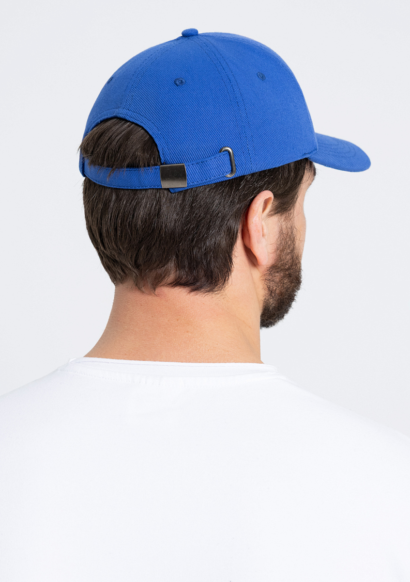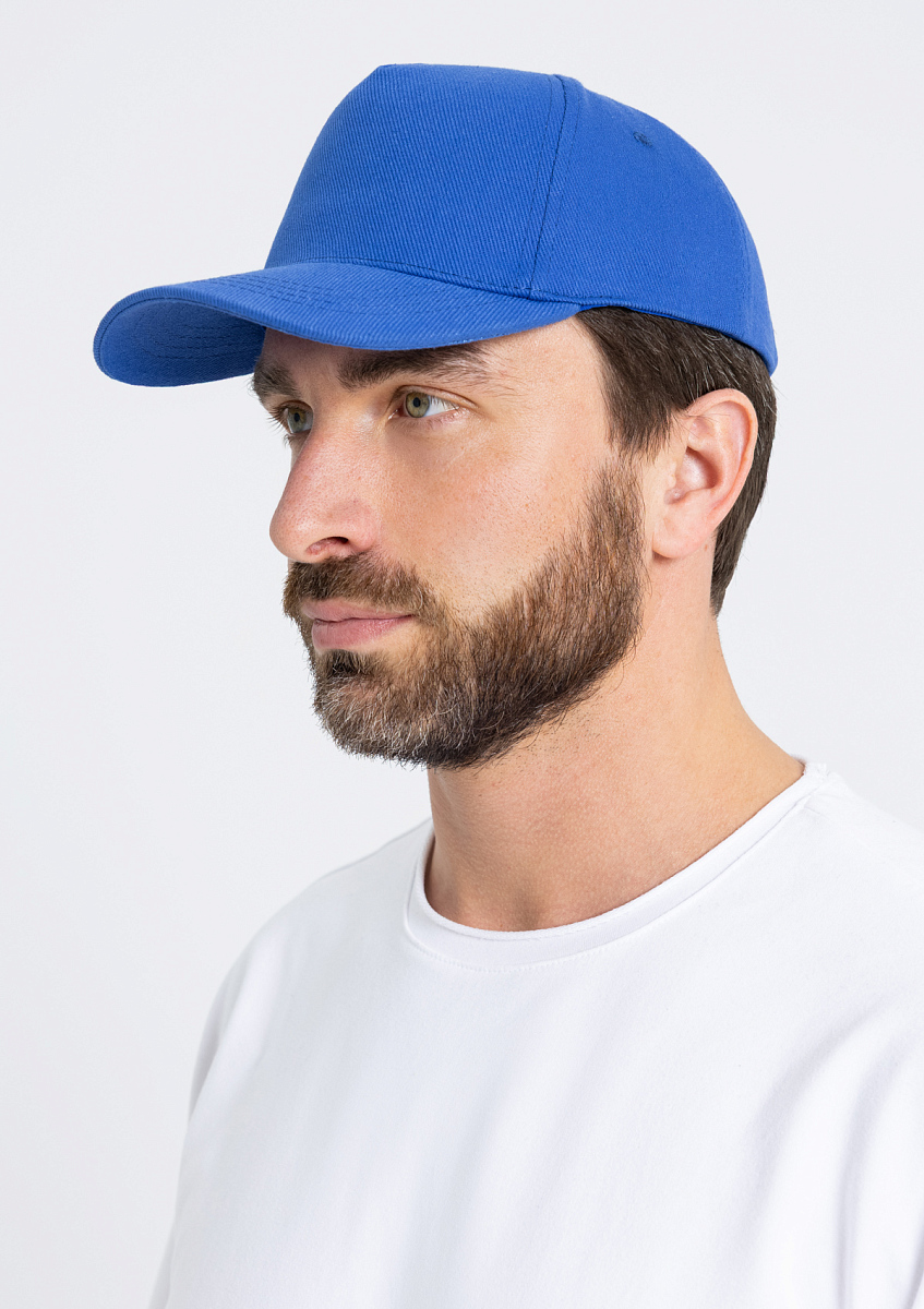 Бейсболка-пятиклинка без лобового шва с изогнутым жестким козырьком и регулируемой металлической застежкой.