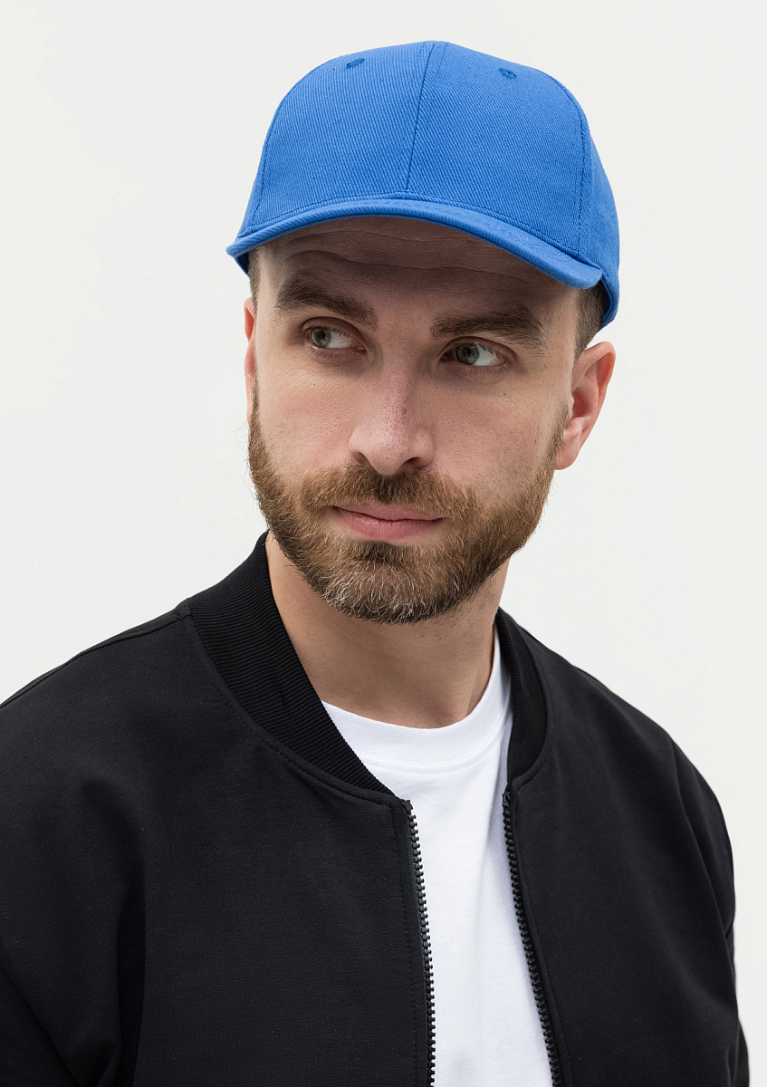 Бейсболка-шестиклинка с изогнутым жестким козырьком, прилегание регулируется ремешком с металлической застежкой.