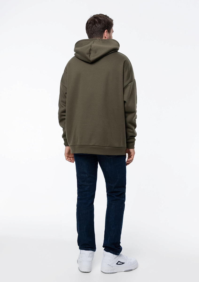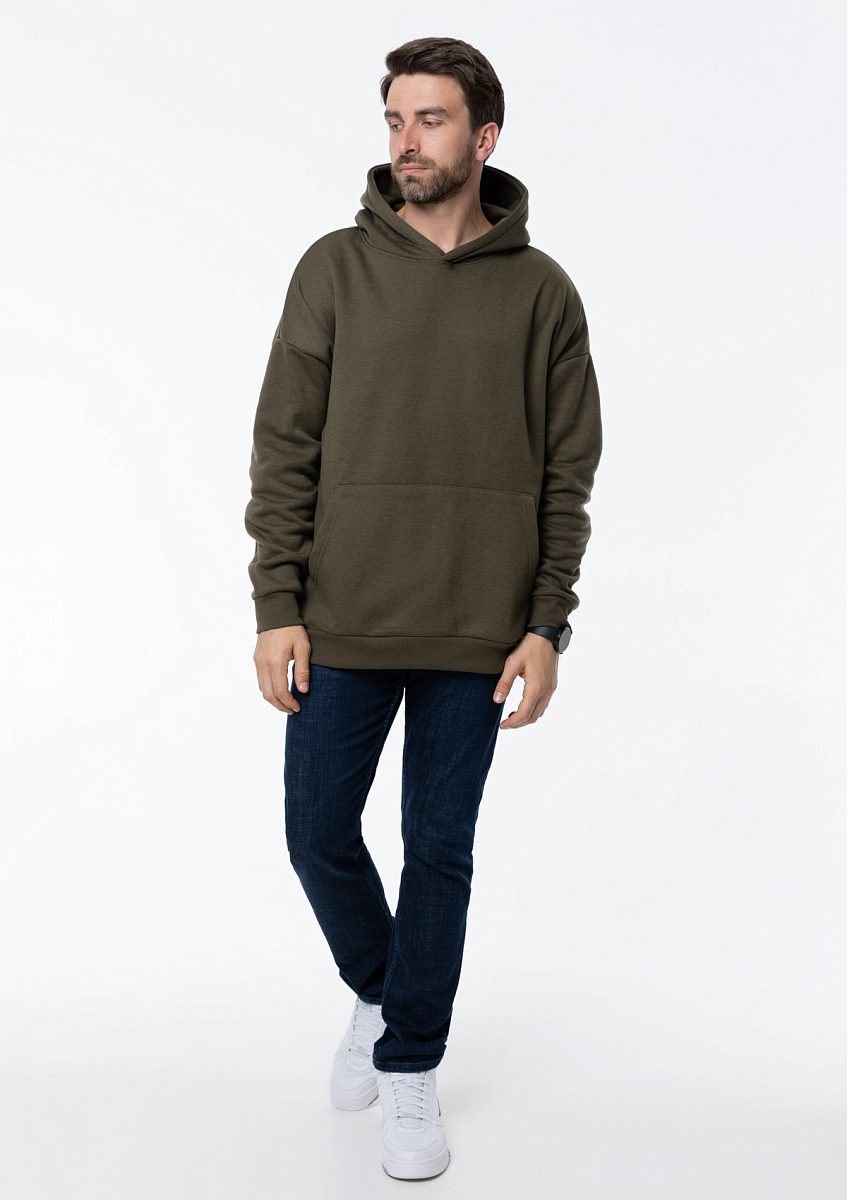 Толстовка свободного силуэта с капюшоном комфортной глубины, спущенной линией плеча и глубоким карманом-кенгуру. Манжет и низ изделия оформлены широкой эластичной резинкой в тон основному цвету.