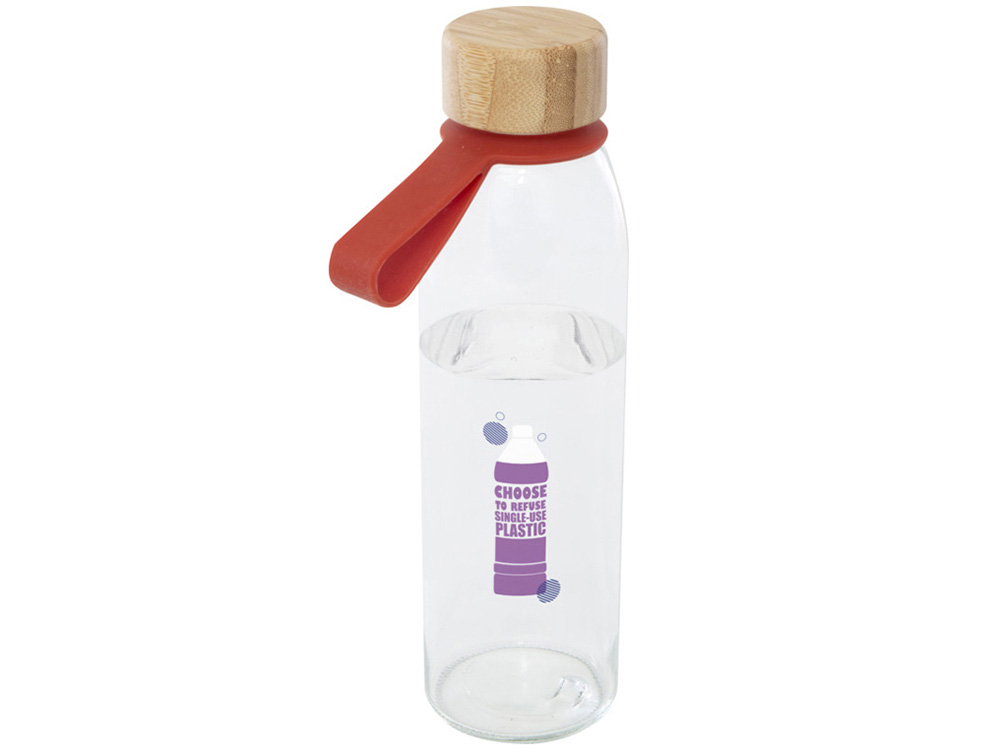 Одностенная стеклянная бутылка для воды с завинчивающейся бамбуковой крышкой, произведенной из более устойчивых и социально ответственных источников. В комплект входит удобный силиконовый ремешок для удобной переноски. Поставляется в подарочной коробке из переработанного картона. Объем: 500 мл. Стекло, FSC certified bamboo. упаковка FSC Mix Credit P5.1 CU-COC-877277. FSC 100% N5 CU-COC-877277.