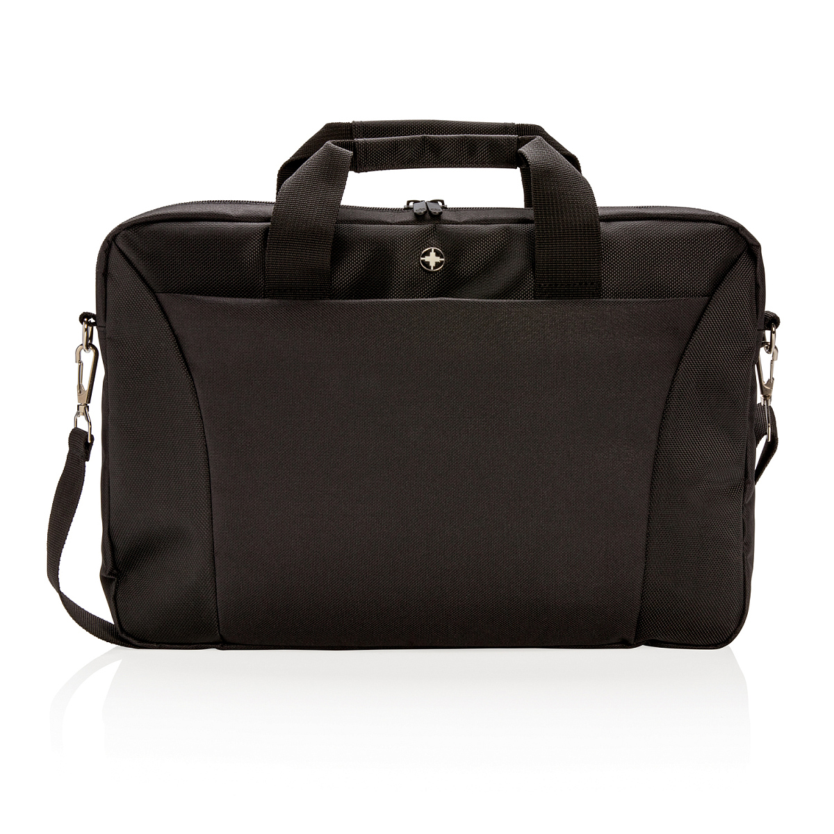 Удобная сумка для ноутбука Swiss Peak из прочного полиэстера 600D и 1680D. В сумке предусмотрен мягкий карман для ноутбука, отделение для планшета и передний карман на молнии с органайзером для хранения различных аксессуаров. Для вашего комфорта в путешествиях в конструкции сумки предусмотрены крепления на выдвижную ручку чемодана. В комплекте идет регулируемый плечевой ремень. Не содержит PVC. Длина 4,5 см., ширина 27 см., высота 39 см., диаметр 0 см.