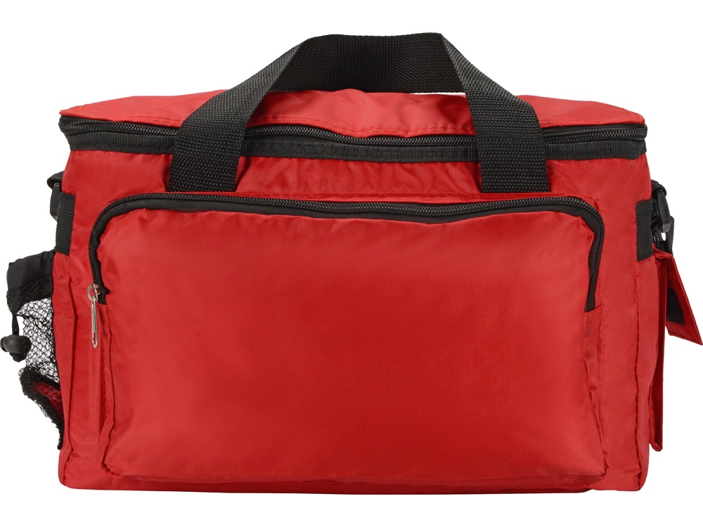 Вместительная сумка-холодильник (объем – 15 л.) Камайоре прекрасно подойдет не только для индивидуальных пикников, но даже и для доставки горячих продуктов (пиццы, например). С боков 2 кармана – один сетчатый с регулируемой затяжкой для бутылки. Другой для приборов, салфеток или других мелочей закрывается на липучку. Наружный слой сделан из полиэстера, на него может быть нанесена персонализация: имя владельца или логотип компании.