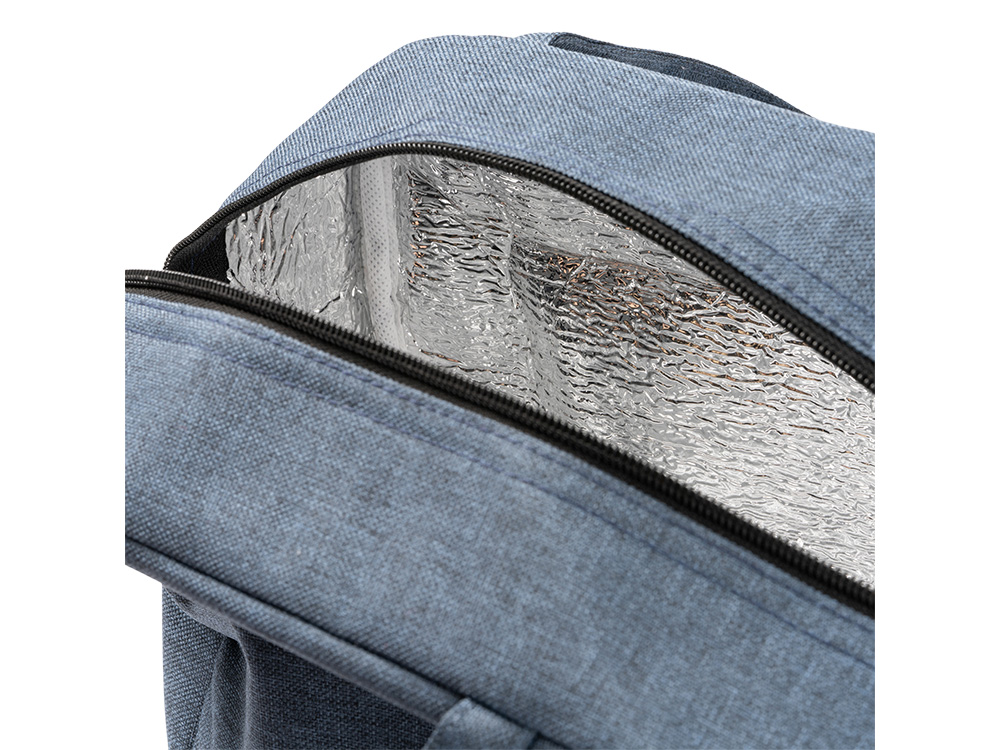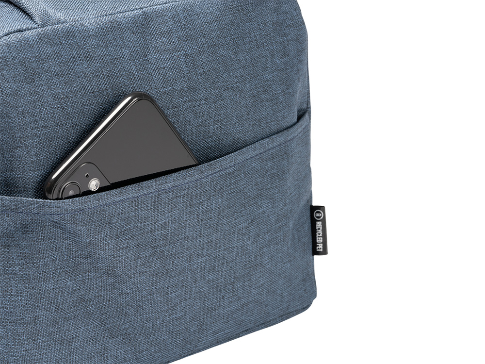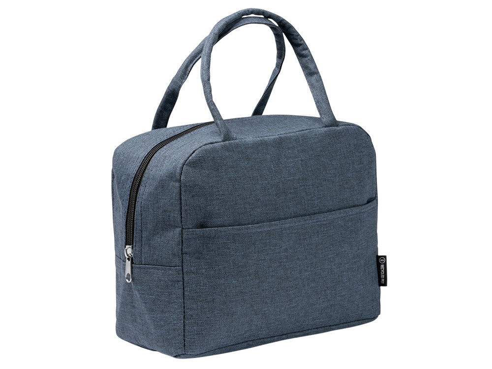 Термосумка из переработанного ПЭТ плотностью 600D с изотермической внутренней поверхностью. Передний карман и мягкие круглые ручки.