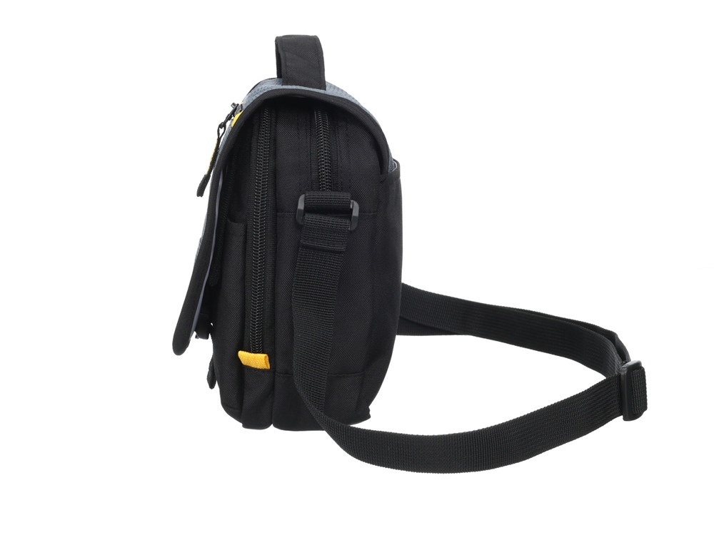 Изделие выполнено в чёрном цвете с серыми вставками и элементами дизайна желтого цвета. Компактный размер изделия – 15х5х22 см, аккуратно скрывает вместительный объём сумки.