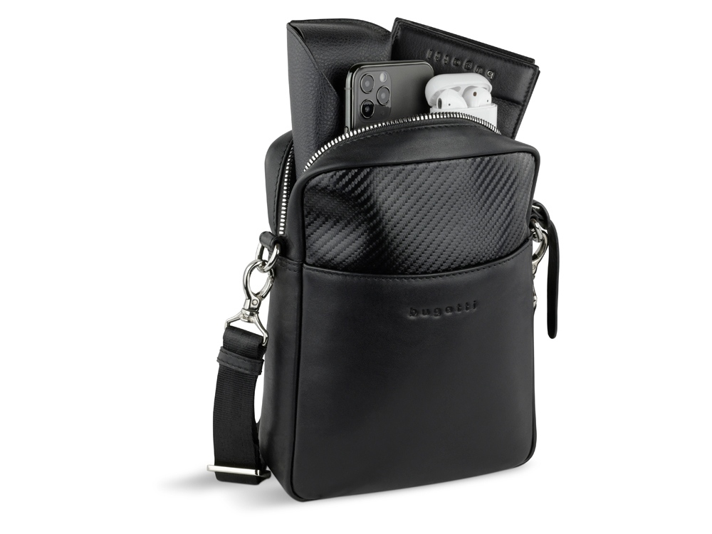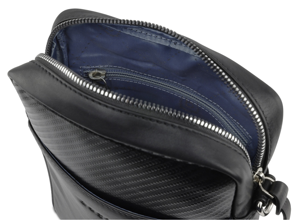 Функциональная организация: основное отделение на молнии с карманом на молнии и открытым карманом, передний карман, задний карман на молнии, съемный регулируемый плечевой ремень (до 140 см).