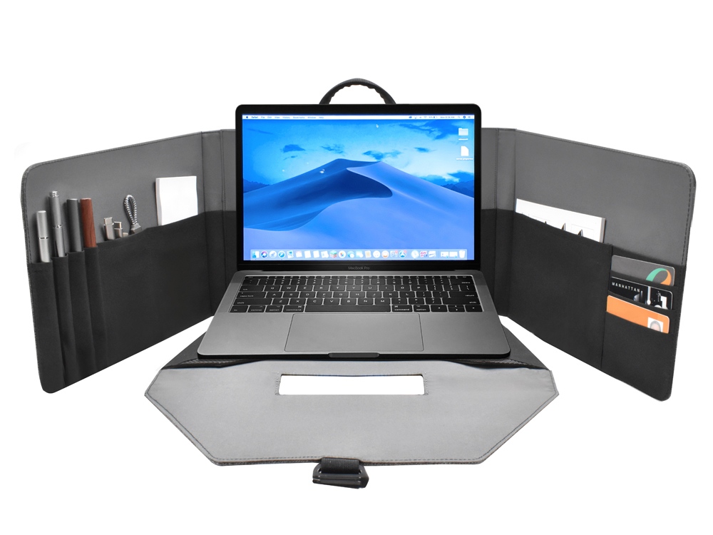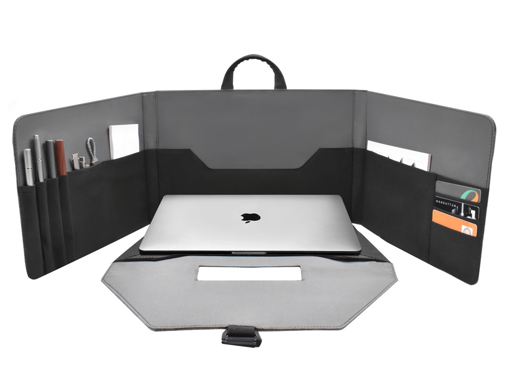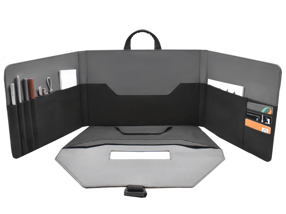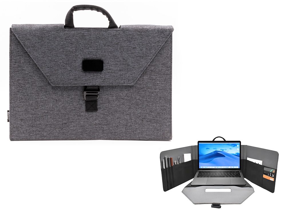 Легкая и функциональная сумка для ноутбука15'' или планшета, которая быстро трансформируется в комфортабельное переносное рабочее место. Степень наклона ноутбука при работе регулируется липучкой. Внутри предусмотрен органайзер для канцтоваров, смартфона, бумажника и карточек. Застежка надежно фиксирует сумку на закрытом виде. Вы сможете работать в любом месте и любой обстановке.