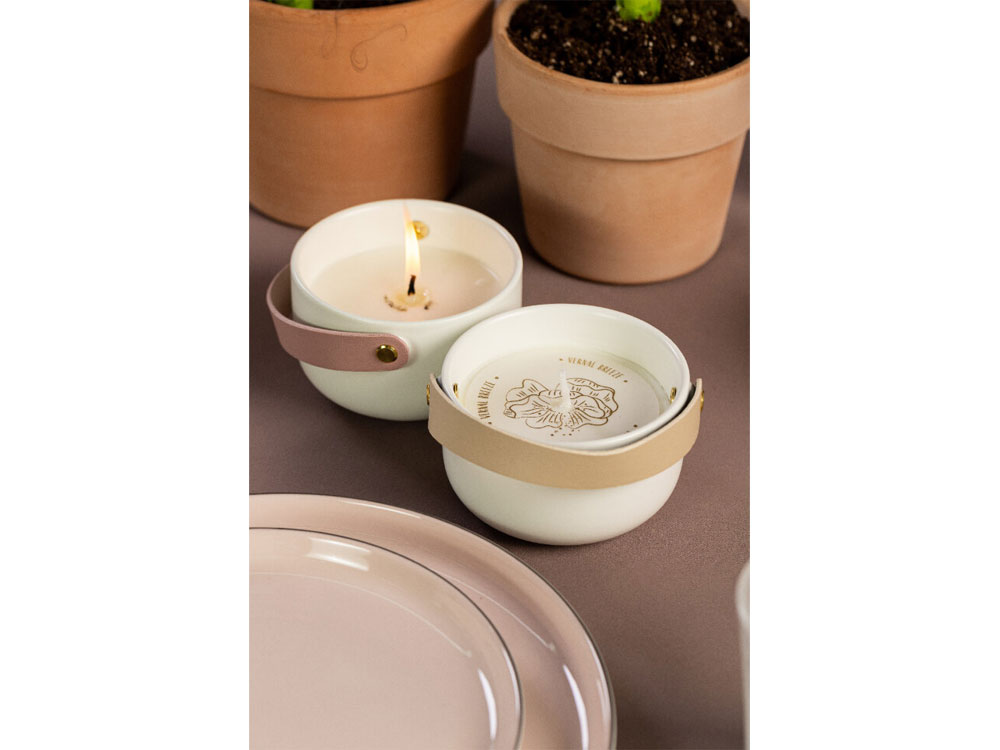Стильная свеча в фарфоровом кашпо с крышкой и кожаными ручками от Valerie Concept. Изготовлена из натурального соевого воска с хлопковым фитилем, подарит вам долгие часы наслаждения и умиротворения, благодаря нежному аромату с нотками чарующих цветов и хлопка.
