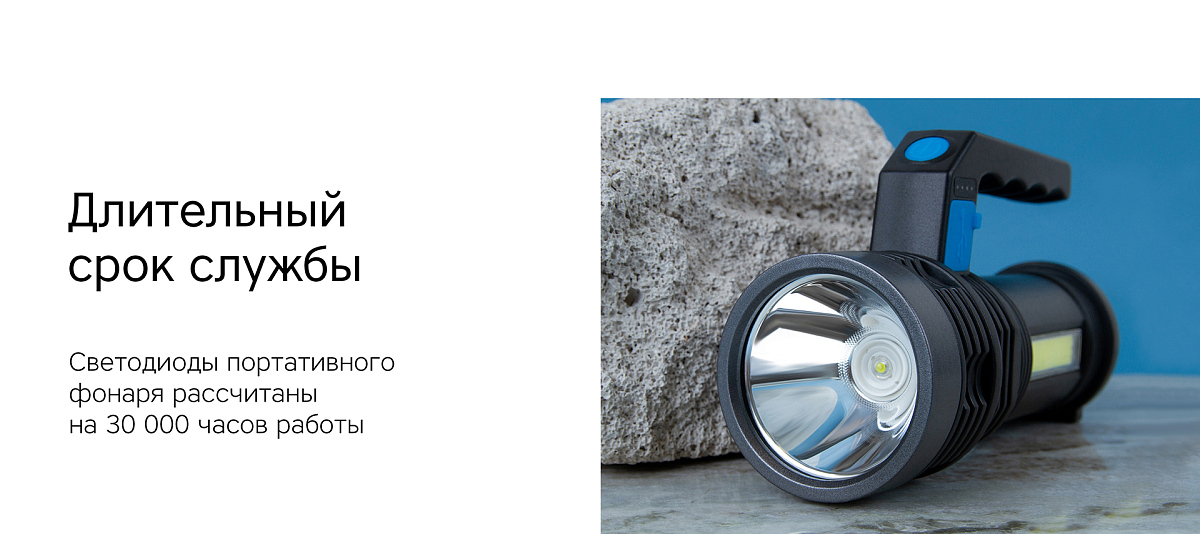 Особенности: встроенный аккумулятор обеспечивает длительное время работы без подзарядки; 3 режима работы: максимальная яркость, минимальная яркость и мерцание; удобная ручка обеспечивает надежный хват одной рукой; дополнительный светодиод в корпусе; зарядка от любого USB порта