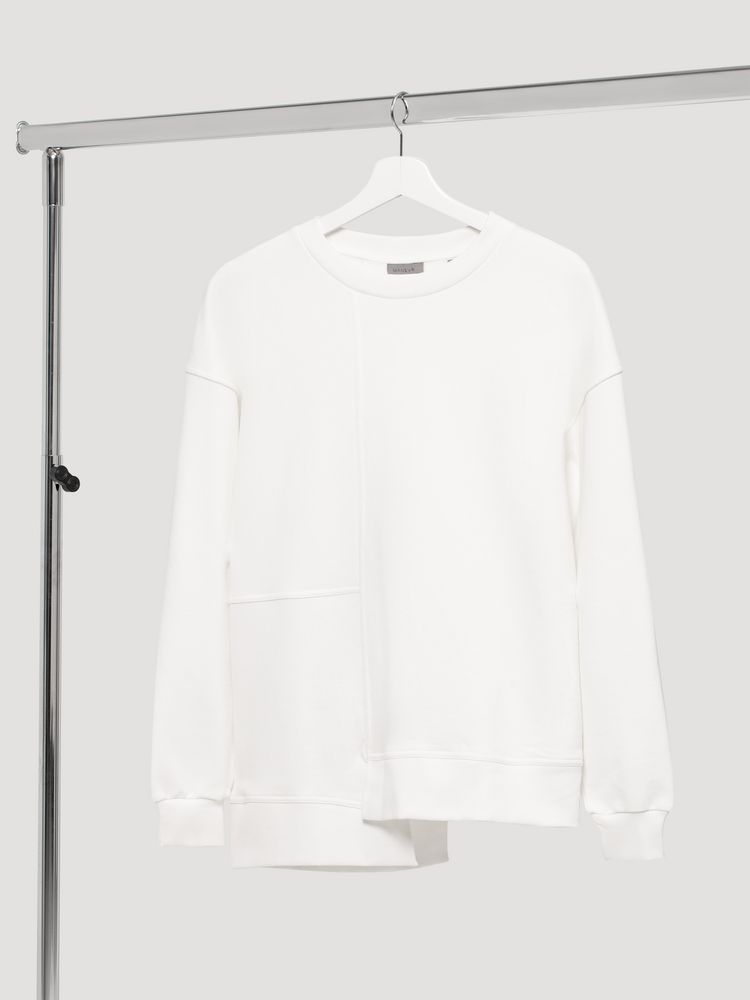 Свитшот унисекс свободного кроя со спущенным плечом и нестандартным нижним краем.