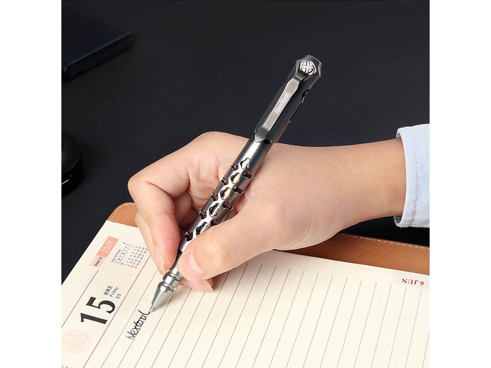 Тактическая ручка с вольфрамовой головкой и аэрокосмическим стержнем; материал корпуса: алюминий авиационного класса 6060-T6. Данный экземпляр весит всего 22 г, что практически вдвое легче куриного яйца. В качестве материала, из которого был изготовлен корпус, использовался специальный алюминиевый сплав марки T7075.