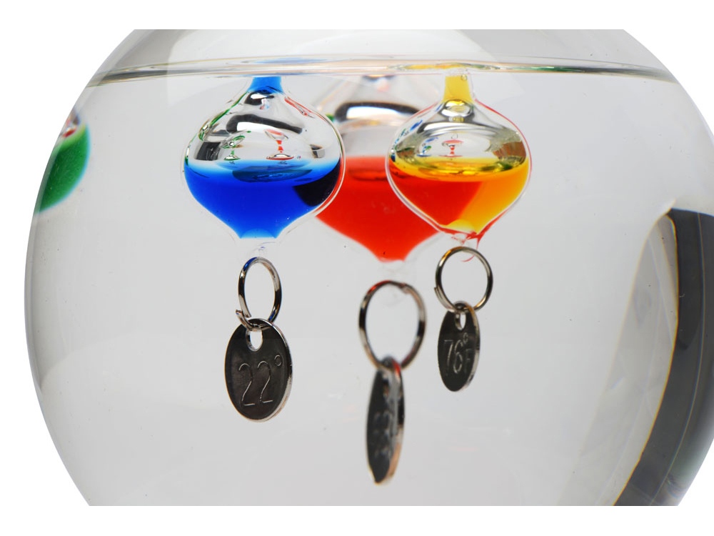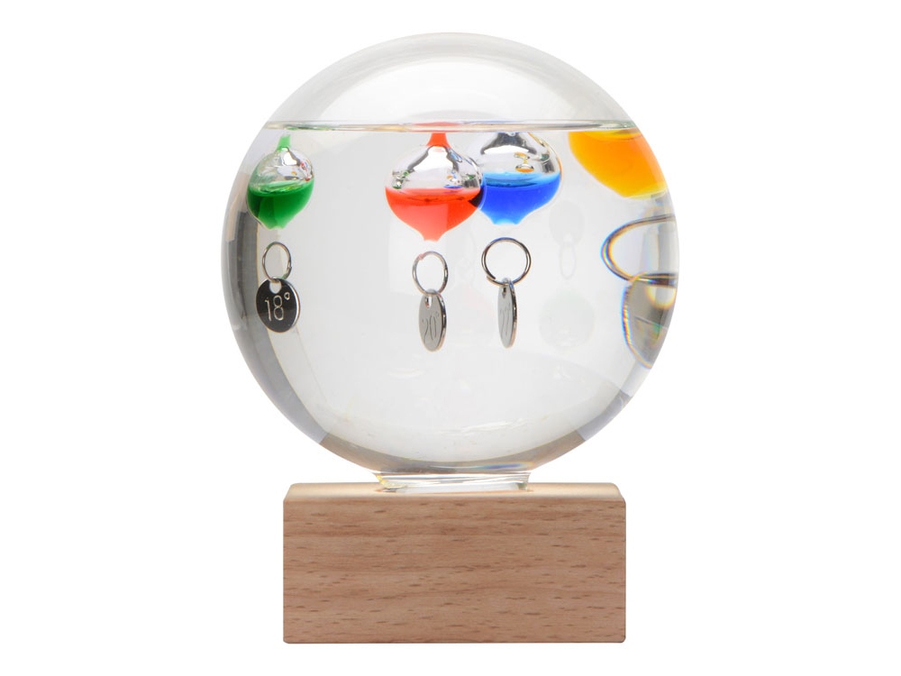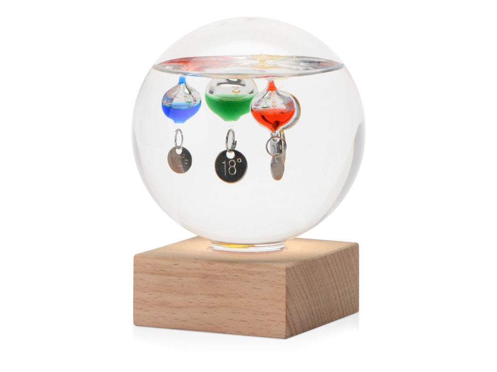 В основе действия этого круглого стеклянного термометра – принцип действия реально существовавшего и популярного в свое время термометра Галилея, который представлял, правда, не шарик, а высокую колбу с такими же стеклянными буйками, в каждом из которых – жидкость разной плотности. На каждом из буйков висит табличка с температурой, указанной в градусах Цельсия и Фаренгейта. Не укатиться шарику помогает деревянная подставка.