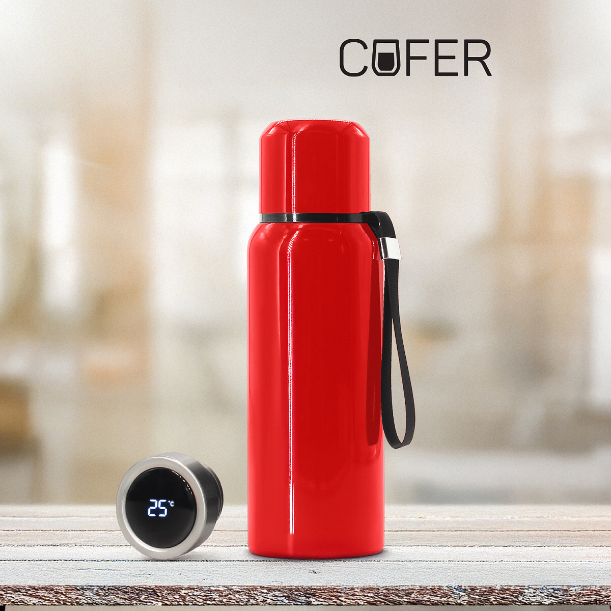 Термос S-TRAVEL — новинка бренда COFER c глянцевым покрытием является воплощением минималистичного дизайна. На крышке находится сенсорный дисплей, который показывает температуру напитка.