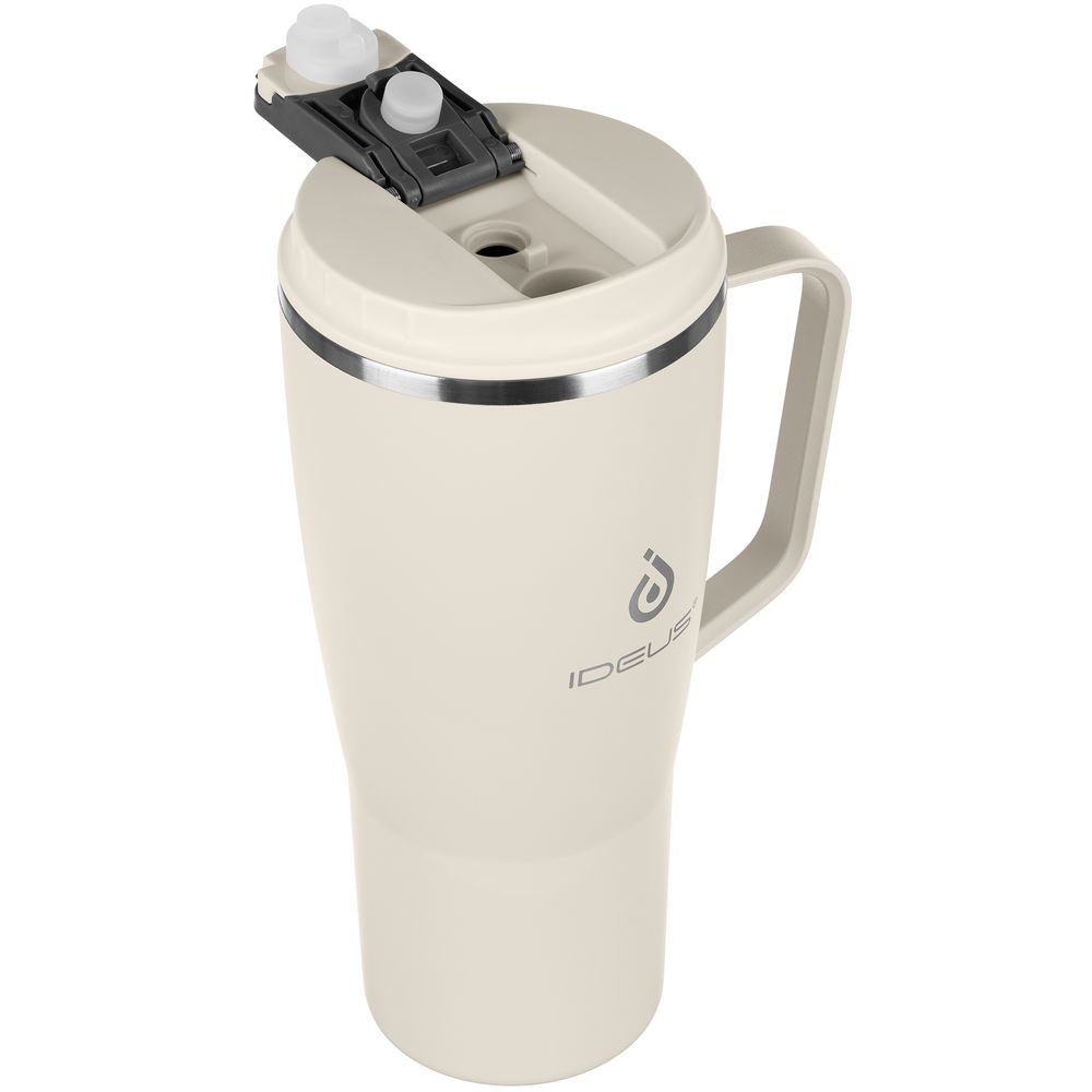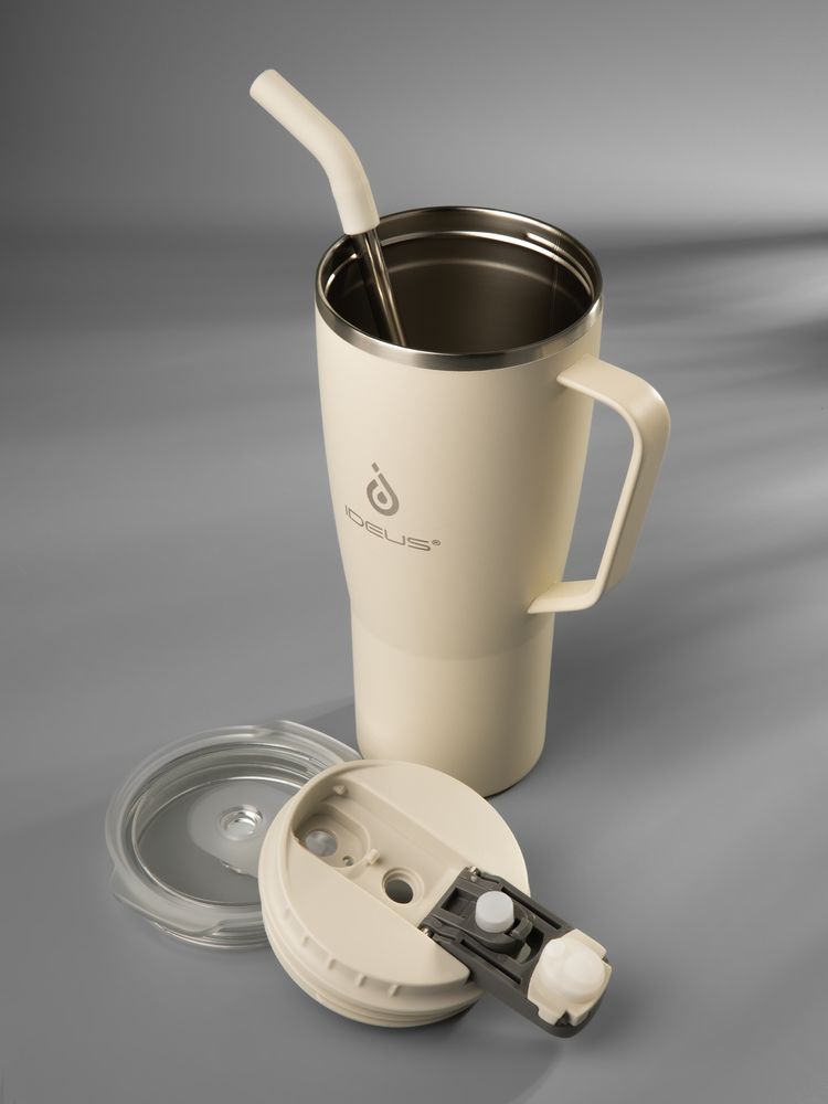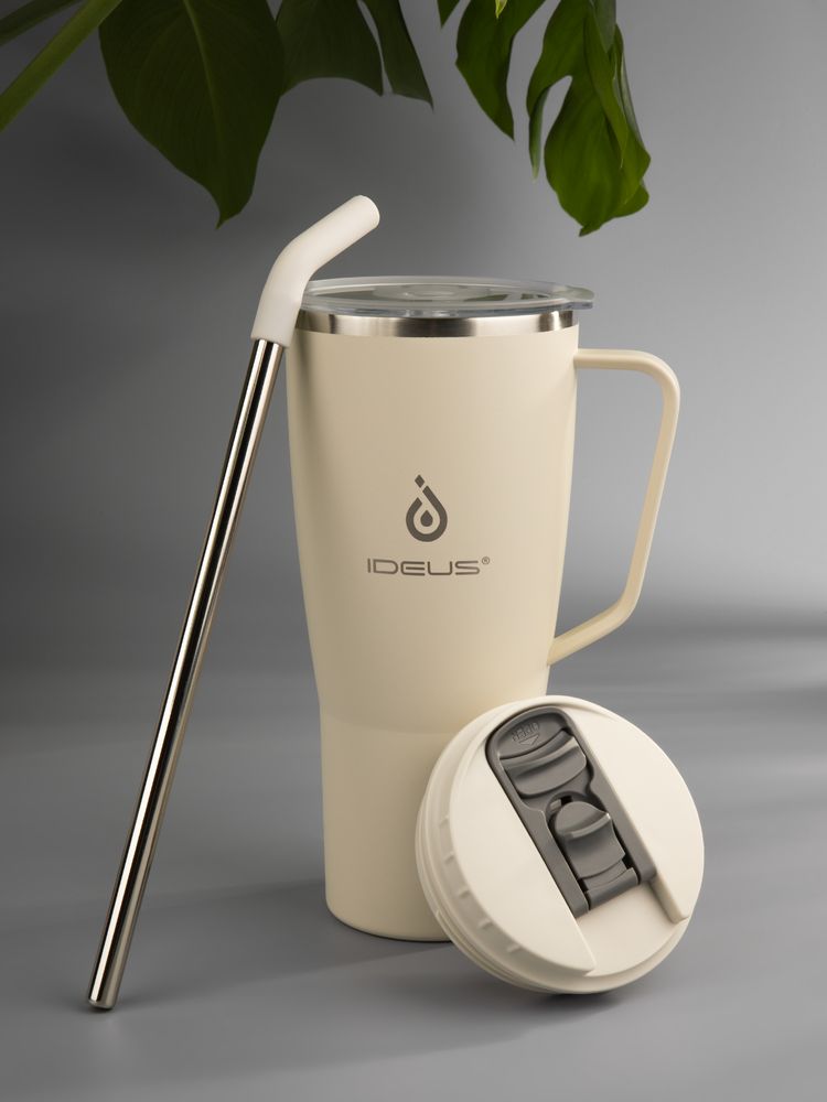 - 2 крышки в комплекте: одна на 100% герметичная с механизмом блокировки отверстия для питья, вторая — с отверстием для трубочки