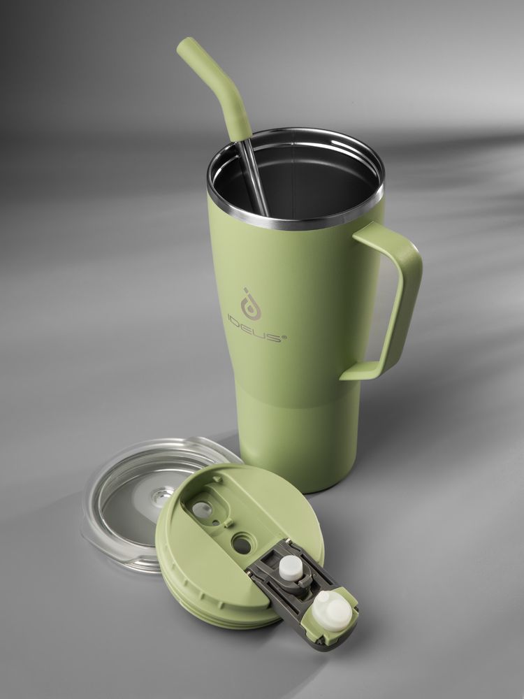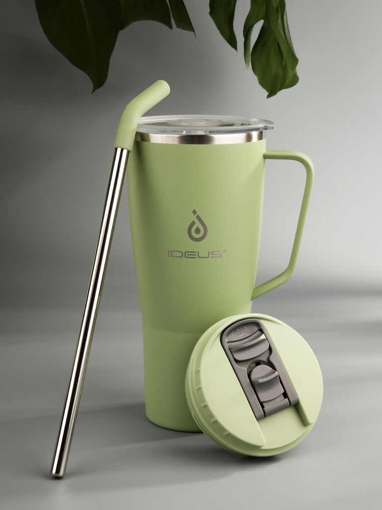 - 2 крышки в комплекте: одна на 100% герметичная с механизмом блокировки отверстия для питья, вторая — с отверстием для трубочки