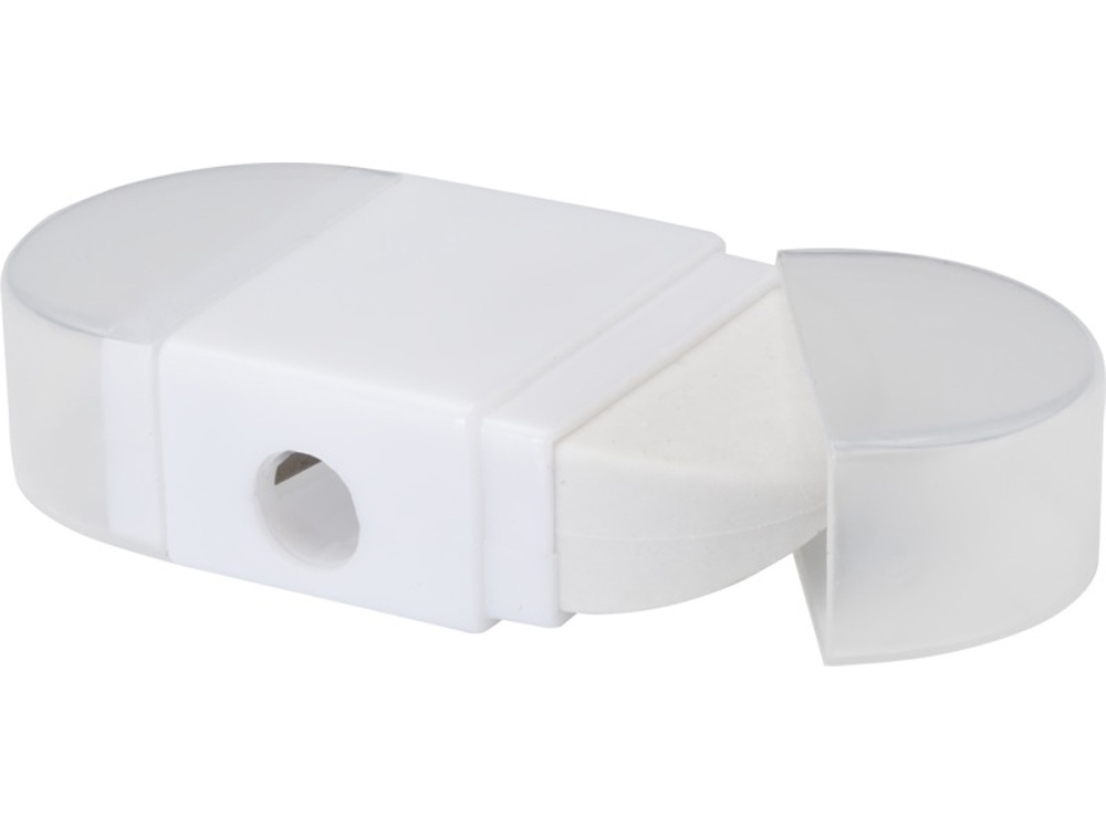 Точилка для карандашей с ластиком и прозрачными колпачками с обеих сторон. Размер: 6,2 x 3,3 x 1,6 см. Пластик ABS, Пластик TPR.