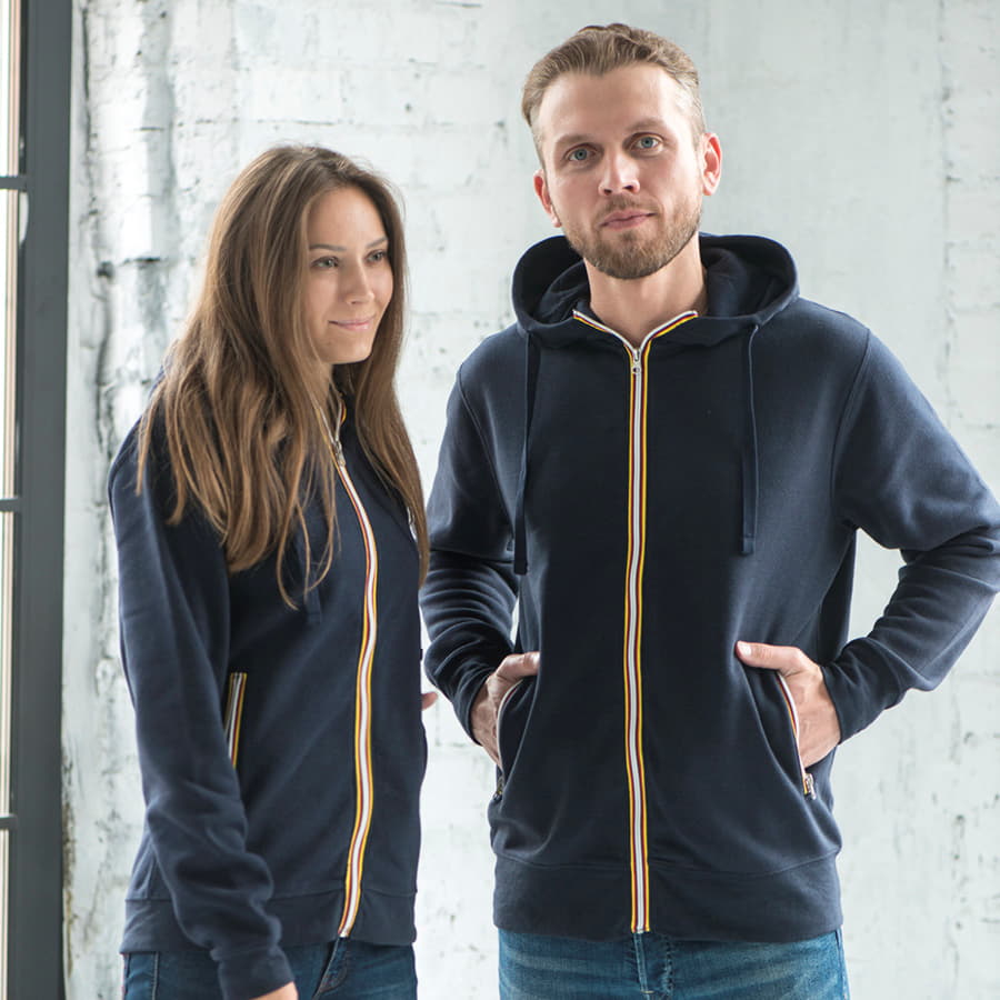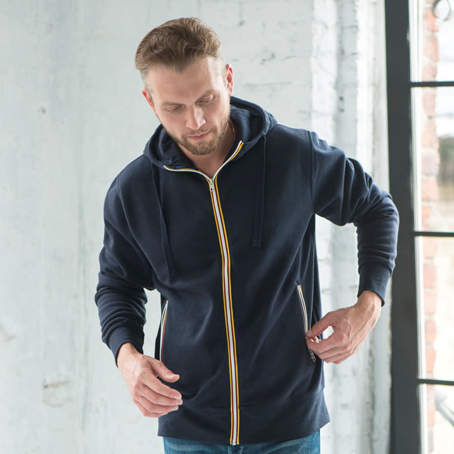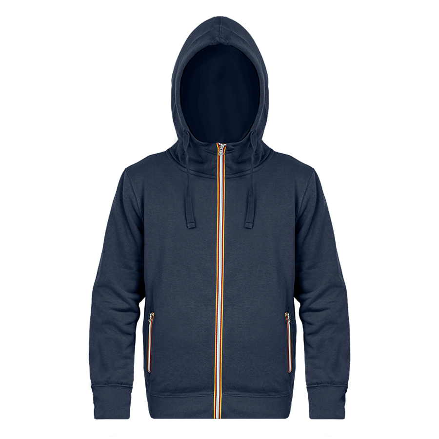 Комфортная толстовка худи на молнии LAS VEGAS MAN из футера с начёсом, плотностью 280 г м² и смесовым составом: 65% полиэстера и 35% хлопка. С таким составом изделия не деформируются и служат долго. Капюшон с подкладом и удобным высоким воротником-стойкой. Шов горловины усилен мягкой лентой Низ толстовки и рукава из эластичной рибаны. Основная молния и молнии в боковых карманах - контрастные. Материал: футер с начёсом, 65% полиэстера и 25% хлопка, 280 г м².