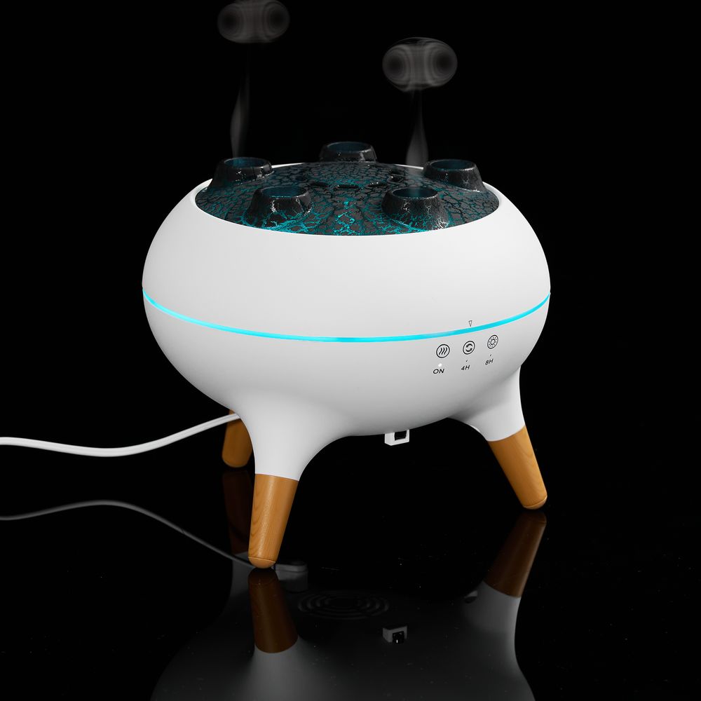 Помимо стандартных струек пара посередине крышки, Cloudini умеет выпускать маленькие облачка влажного воздуха из 5 отверстий по окружности поочередно или динамически — в такт музыке. Устройство реагирует на звуковые колебания и выстраивает интенсивность распыления в зависимости от мелодии.