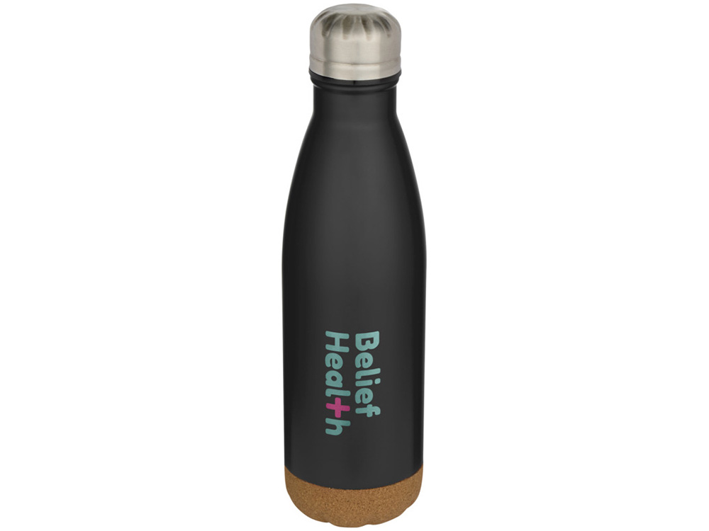 Бутылка для воды из нержавеющей стали с вакуумной изоляцией и пробковыми деталями в нижней части. Двойная изоляция стенок сохраняет напитки горячими или холодными в течение нескольких часов. Поставляется в подарочной коробке из переработанного картона. Объем: 500 мл. 90% нержавеющая сталь, 10% Пробка. упаковка FSC Mix Credit P5.1 CU-COC-877277.