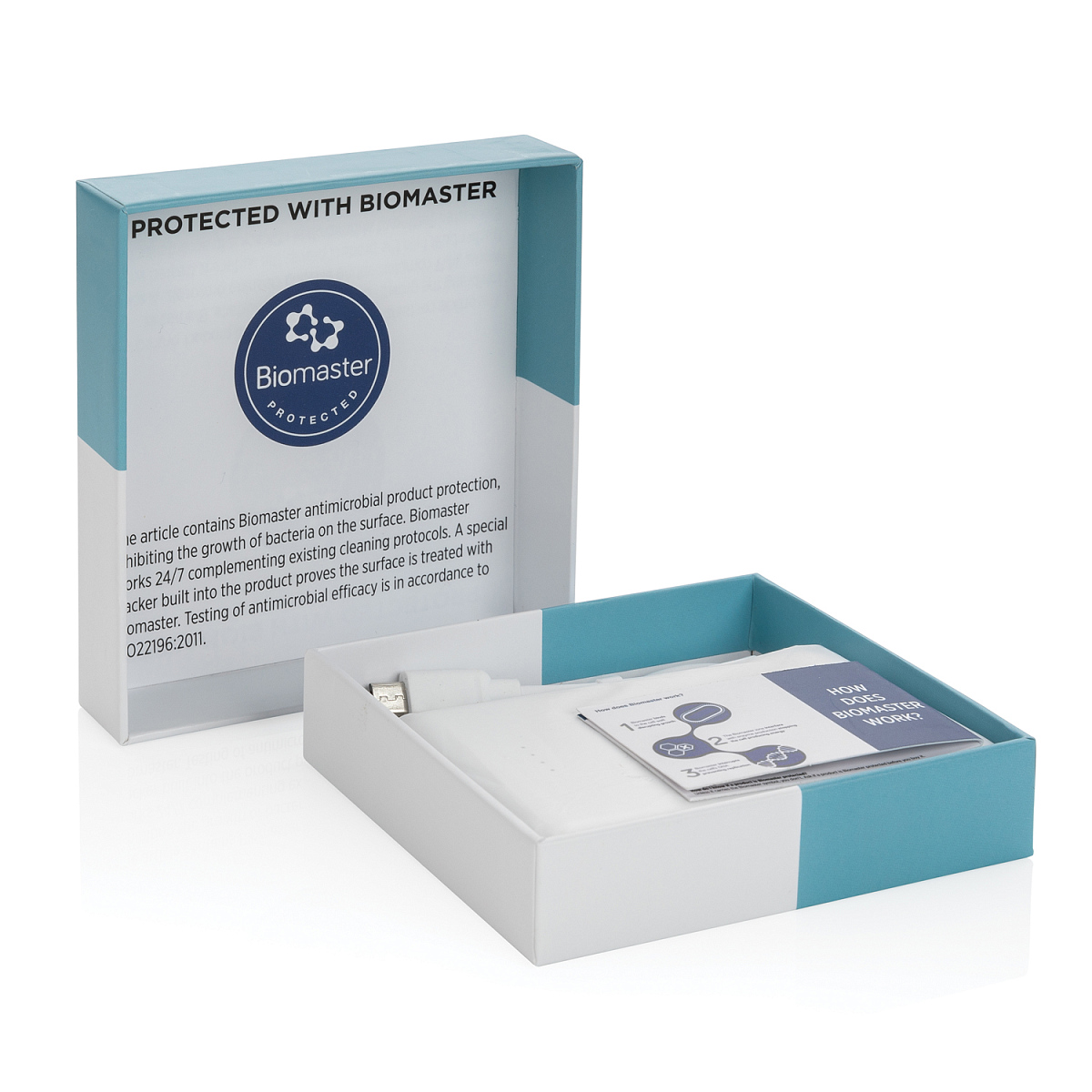 Внешний аккумулятор карманного размера на 5000 мАч сделан из ABS-пластика с добавлением антимикробного агента Biomaster, который обеспечивает дополнительную защиту от вредоносных бактерий. Антимикробный агент находится в материале изделия, а не только на поверхности, поэтому эффективность защитных свойств с течением времени не изменится. Товар протестирован в соответствии с международным стандартом антибактериальной эффективности ISO 22196, на 100% безопасен для пользователей. Кроме того, наличие антимикробного агента Biomaster не влияет на пригодность материала для вторичного использования. Изделие содержит уникальный индикатор Verimaster, позволяющий доказать наличие Biomaster в составе материала, в то время как большинство аналогичных изделий на рынке не могут подтвердить заявленные антимикробные свойства. Устройство оснащено литий-полимерным аккумулятором класса А емкостью 5000 мАч, позволяющим зарядить смартфон до 3 раз. Вход micro USB: 5 В / 2 А; 2 порта USB с выходом: 5 В / 2 А; 4 светодиодных индикатора на передней панели, показывающие уровень заряда устройства. Поставляется в подарочной коробке с подробной информацией об антимикробном агенте Biomaster. Длина 6,3 см., ширина 1,5 см., высота 9,4 см., диаметр 0 см.