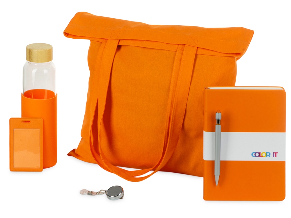 Welcome pack для нового сотрудника, в который входит все самое необходимое для комфортной адаптации в новом офисе: блокнот с магнитным держателем для ручки и карманом для визиток, ручка, чехол для пропуска с ретрактором, стеклянная бутылка для воды и шоппер.