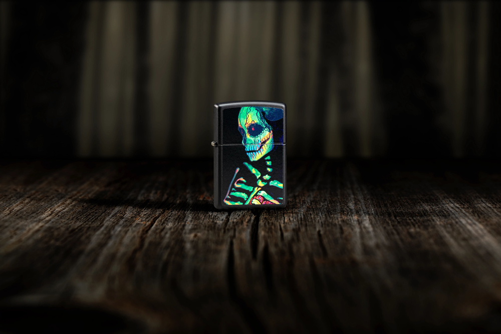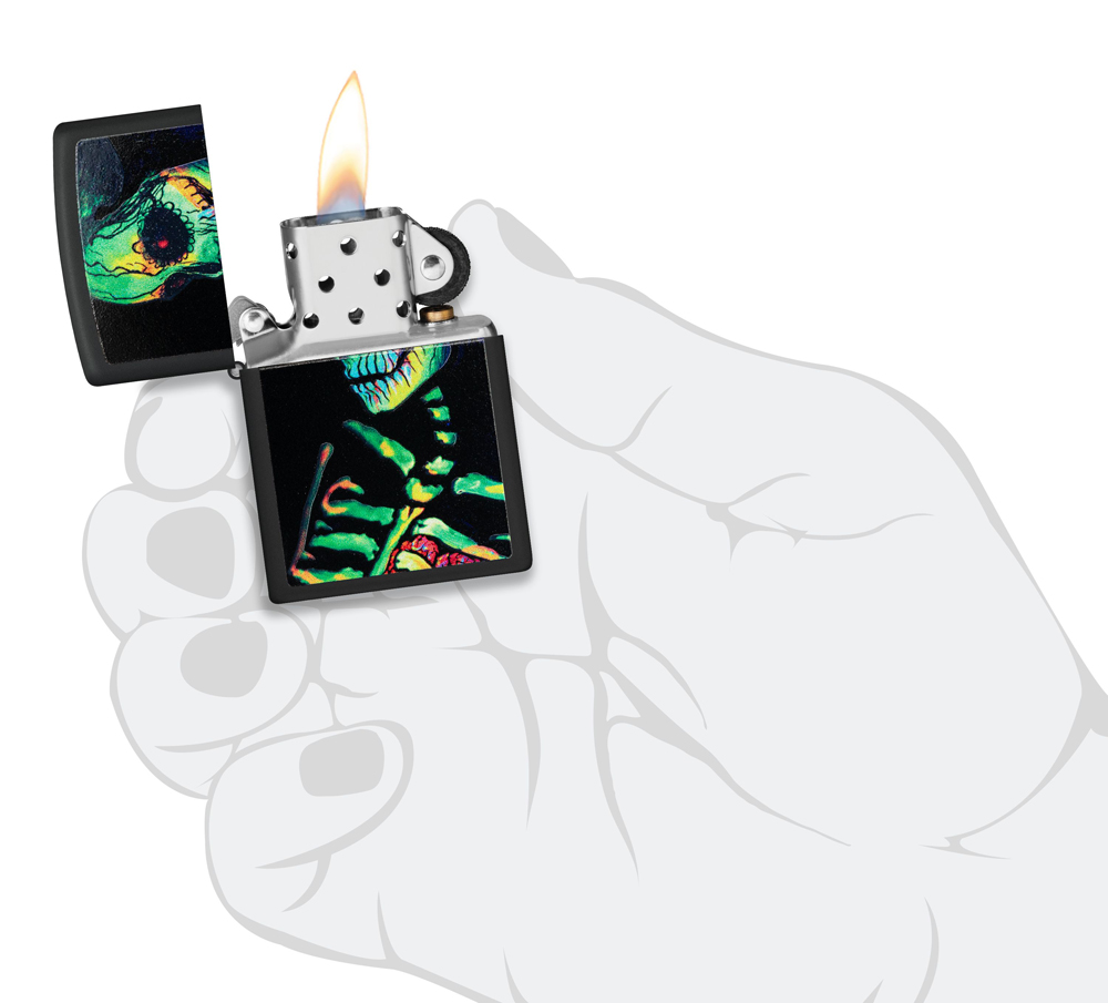 Зажигалка ZIPPO Skeleton Design с покрытием Black Light, латунь/сталь, черная, матовая, 38x13x57 мм можно заказать в нашей компании по самой доступной цене от 8 320 рублей.