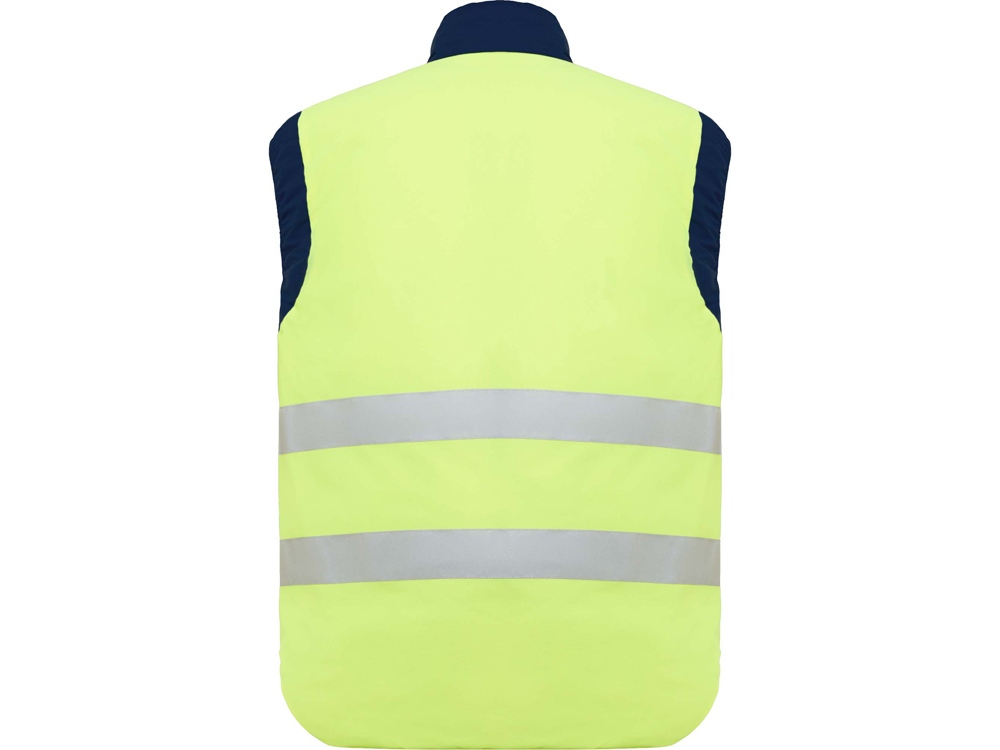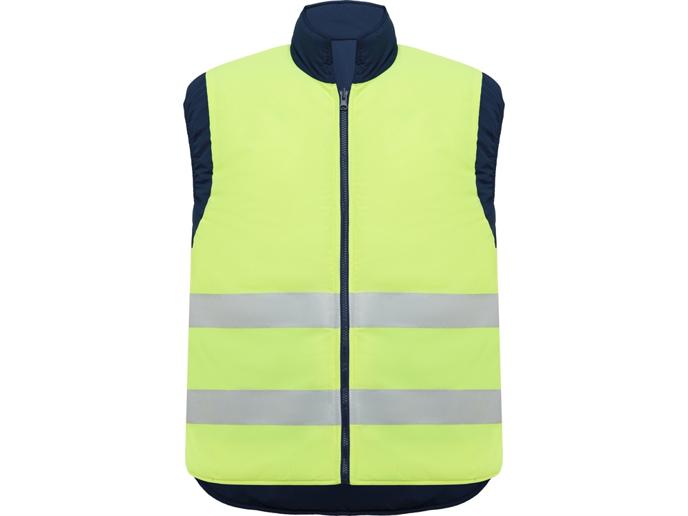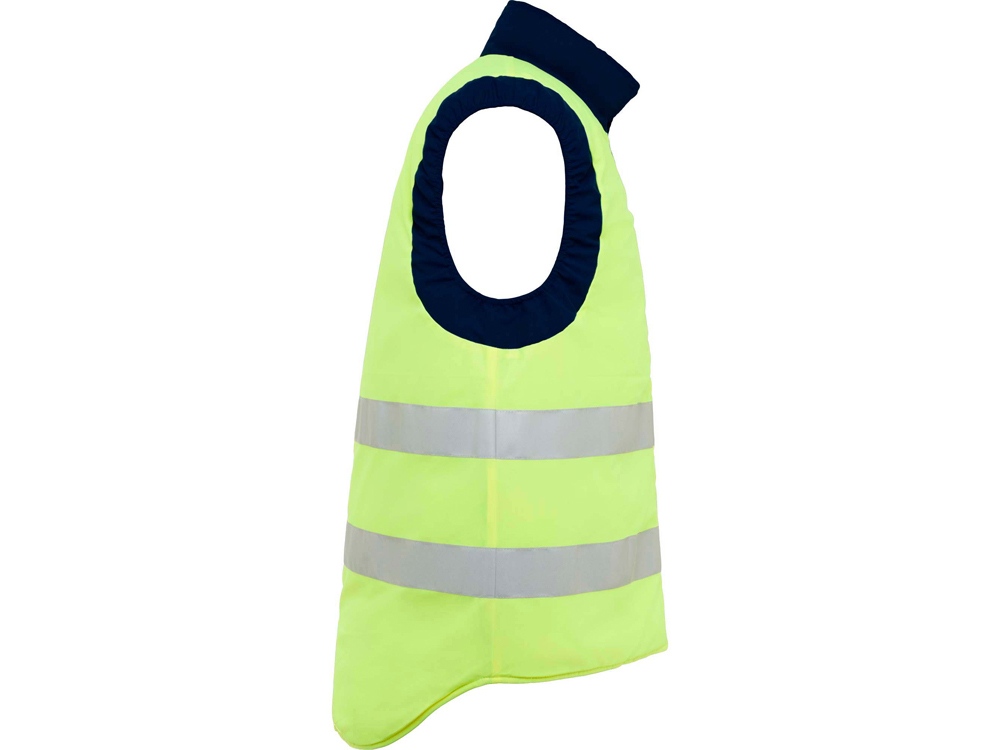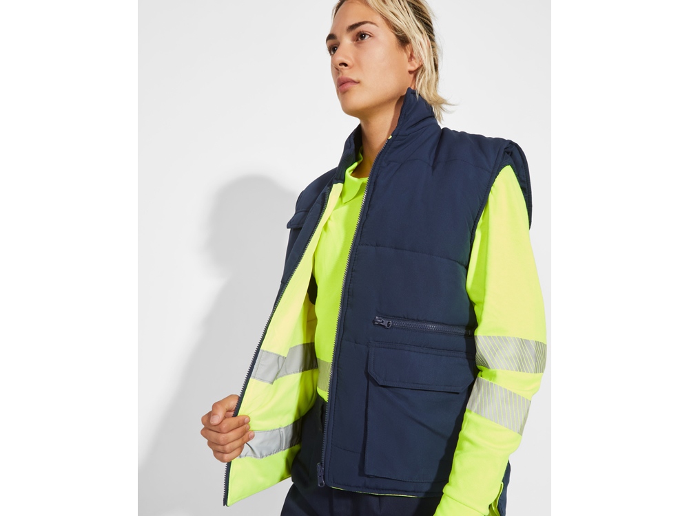 Двусторонний жилет с карманами и высоким воротником. Жилет с несколькими карманами. · Застежка·молния спереди с двусторонним бегунком. · Правый наружный карман для мобильного телефона. · Два передних кармана с боковыми прорезями. · Два кармана для ручек. · Карман на застежке·молнии. · Ветровики на манжетах. · Приталенный низ. · Эластичный регулятор. · Светоотражающие элементы на жилете. · Флуоресцентный цвет. · Две горизонтальные светоотражающие полосы.
