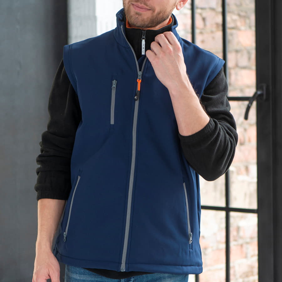 Основная ткань: цвет, близкий к Pantone 289 С, подкладка: цвет, близкий к Pantone 2965 C Двухслойная ткань softshell. Водонепроницаемый и дышащий мужской жилет. Небольшой воротник-стойка. Обратная контрастная пластиковая молния со съемным пуллером. Один нагрудный и два боковых кармана с обратной молнией. Утягивающий шнурок по низу жилета.