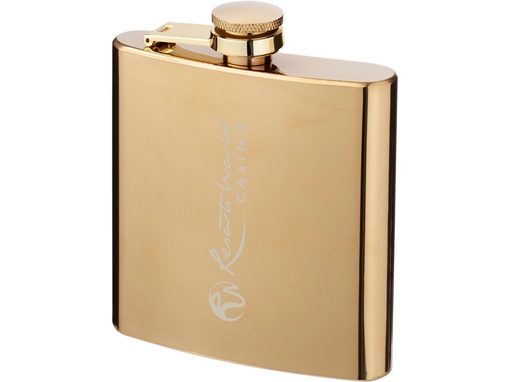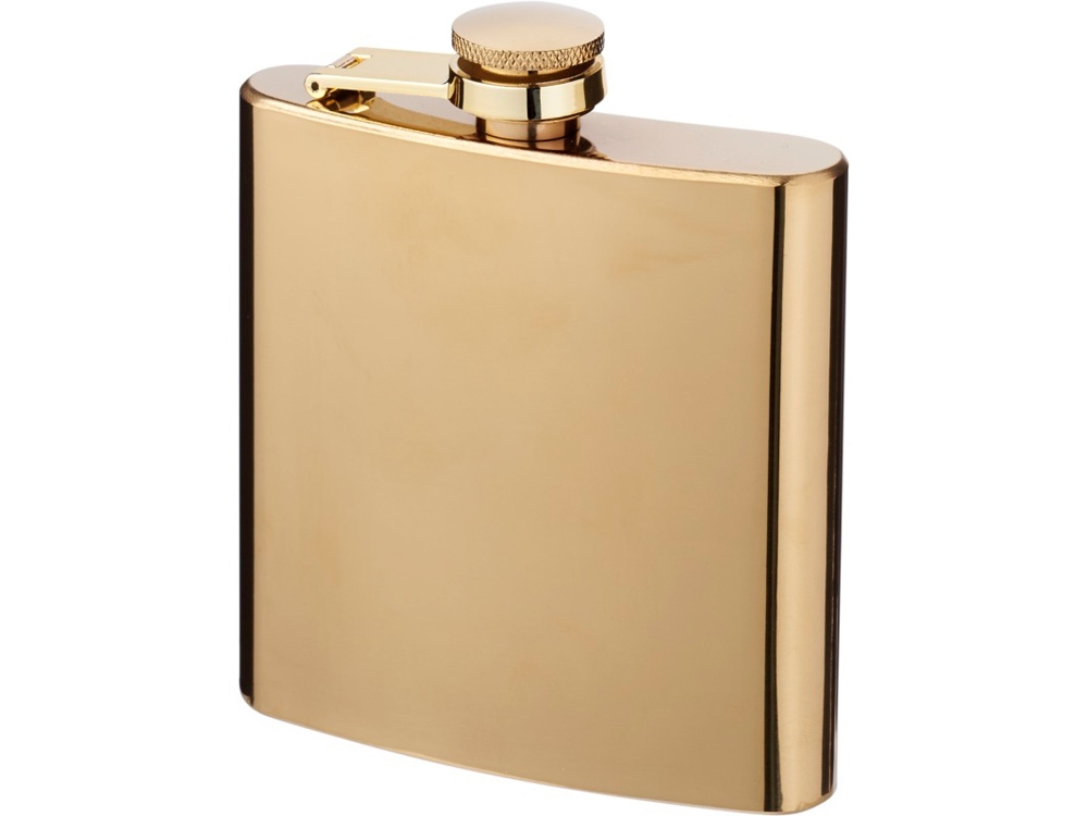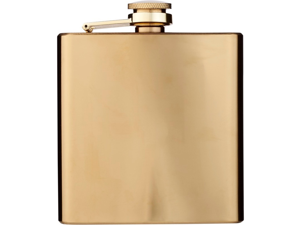 Золотистая плоская фляга Elixer объемом 175 мл. Одностенная фляга с закручивающейся крышкой. Гальваническое напыление золотистого цвета. Объем — 175 мл. Нержавеющая сталь.