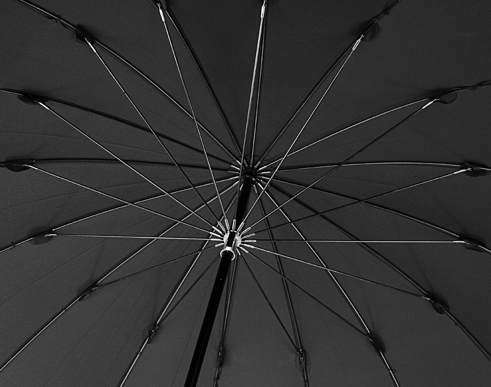 Солидный изысканный зонт с ручкой из дерева и 16 спицами. Большой купол легко укроет от дождя сразу двоих, а надежная конструкция выдержит даже сильный ветер.