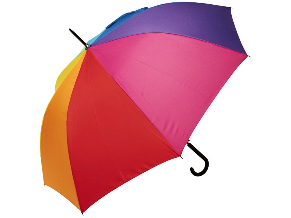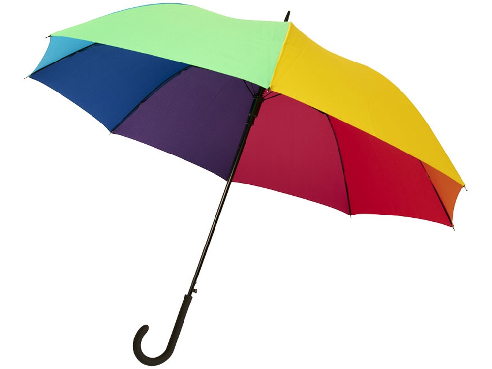 23-дюймовый ветрозащитный полуавтоматический зонт Sarah. Зонт с куполом из эпонж полиэстера, раскрашенный в цвета радуги. Прочный металлический стержень, высококачественная цельная рама из стекловолокна, обеспечивающая максимальную гибкость в ветреную погоду. Выгнутая ручка с мягким матовым покрытием, никелированные верхняя втулка и кончики спиц. Большая область для декорирования на каждой из панелей купола позволяет предложить различные креативные решения для логотипа. Эпонж полиэстер.